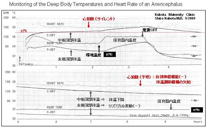 | 4. | 「低体温⇔低血糖」の悪循環が進むと、人間の自律神経系は機能マヒに陥り、生命維持機構、体温調節機構にトラブルが発生する。「低体温⇔低血糖」に陥った赤ちゃんは、恰も体温調節中枢が欠如した無脳児と似た体温変動(変温動物的)、心拍変動(サイレント)を示す。 一旦、「低体温⇔低血糖」の悪循環が成立すると、@保温、A糖分の補給、B酸素投与の医学的管理がなければ、カンガルーケア中の医療事故(ケイレン、呼吸停止)はいつでも発生する。呼吸停止を早く見つけ、治療するための新生児蘇生のプロを養成するより、「低体温⇔低血糖」の悪循環に陥らないための工夫(@保温、A糖分補給、B酸素投与)が必要である。 ■「低体温⇔低血糖」の悪循環に陥った症例 |