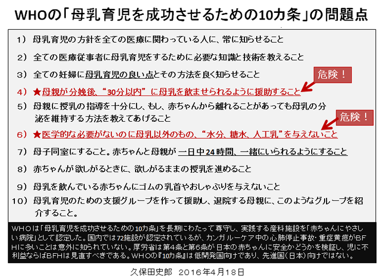 ■完全母乳哺育の問題点 下記の@〜Cは、発達障害の原因(危険因子)である。座長の柳沢委員(元東大小児科教授)は小児科医であるにもかかわらず、宮下委員の生理的体重減少率の最低ラインを15%の発言に、なぜストップをかけなかったのかが問題である。 @高Na血症性脱水 その1、その2 A低血糖症 その1、その2 その3 B重症黄疸 その1、その2 C低栄養 その1、その2 ■生理的体重減少について(久保田産婦人科麻酔科医院) ■出生直後のカンガルーケアの問題点 ■福岡市における障害種別の年次推移 また宮下委員は、カンガルーケア中の心肺停止事故の報告を受けて、肌と肌の触れ合いの部分で、 “言葉の使い方を変えて”載せられるとよいのではないかと思います、と発言している。平成24年10月17日のカンガルーケアから早期母子接触への名称変更が宮下委員の言葉の使い方を変えただけなのである。名称が変わっただけで、本質的な中身は何も変わっていない。策定委員会の問題点は、朝倉委員、今村委員が時期尚早と警鐘を鳴らしていたにもかかわらず、厚労省が検証もせず、低体温症・低血糖症から赤ちゃんを守る安全対策が欠如した支援ガイドを、なぜ慌てて発表したのか、策定委員会の責任は大きい。早期母子接触と名称変更を発表した学会の「早期母子接触」実施の留意点には、生後間もない赤ちゃんの低体温症・低血糖症・高Na血症性脱水・飢餓を防ぐための安全対策は全く無い。名称変更だけでは、心肺停止事故・発達障害児の増加に歯止めは掛からない(久保田)。 |