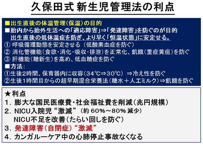 ★現代産科学は出生直後の「低体温症」を生理的現象と誤って定義している。産科医・助産師は低体温症を生理的現象と間違いを教えられているために低体温症を防ごうとしない。 医学会は人生の始まりに低体温症を生理的現象と定義し、間違ってボタンの掛け違いをした。 その結果、胎内から胎外生活への適応障害(チアノーゼ・初期嘔吐、低血糖、黄疸、体重減少)をも生理的現象と誤っている。 赤ちゃんの黄疸は出て当たり前と思われているが、当院では治療を必要とする重症黄疸はまず出ない。出生直後の体温管理を見直すだけでNICU入院児は激減する。 出生直後の低体温症を防ぎ適応障害をなくす医学的管理こそが発達障害児発生防止策である(久保田)。 |