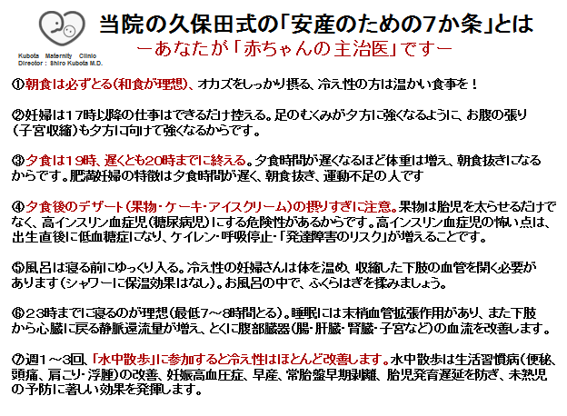 母児の肥満(巨大児=難産因子)を防ぐための正しい食生活習慣を指導、